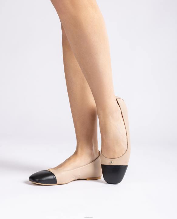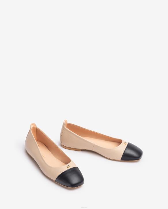 neliömäinen balerinakenkä on valmistettu kontrastivärisestä nahasta. varvas metallista efektinahkaa ja muut kengän osa pehmeää sileää nahkaa. Etuosaan ommeltu kristallikoriste. kevyt, joustava ja luistamaton kumipohja. keskeisiä klassikoita, joita uudistetaan joka kausi.