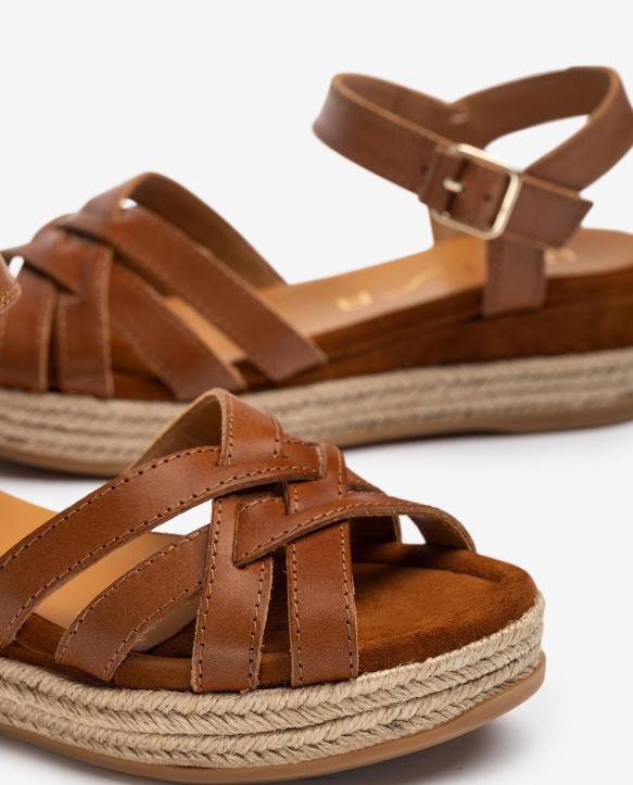 nahkasandaalit, joissa nilkkahihna säädettävällä metallisoljella. kiila yhdistettyjä nahka- ja raffiapunoksia, 5 cm korkea kantapää ja 3 cm alusta. liukumaton, kevyt ja joustava kumipohja. pari täydellisen mukavia kiiloja koko päiväksi.