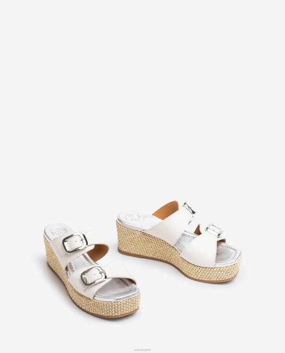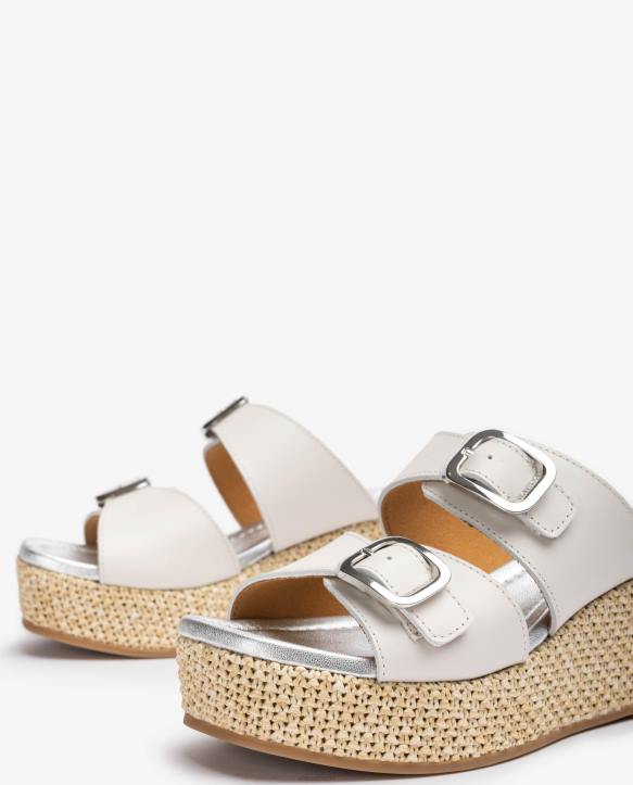 nahasta valmistettu neliömäinen sandaali. kaksinkertainen hihna jalkaterässä, jota voidaan säätää kultaisilla soljeilla. 5 cm luonnollinen raffia päällystetty kiila ja 3 cm alusta. kevyt, luistamaton, kumipohja. mukavuus täyteen loistoonsa.