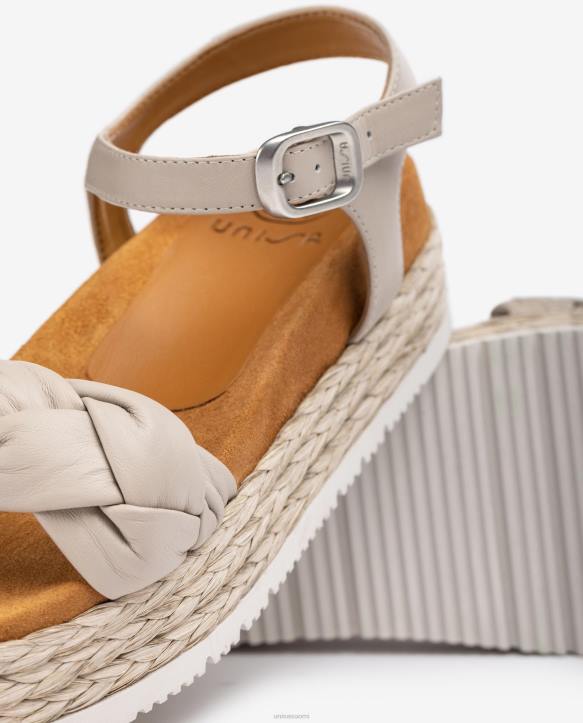 nahkasandaali, jossa on vastaavanvärinen tikattu punos vampissa. nilkkahihnaa voidaan säätää metallisoljella. 4,5 cm juuttipäällysteinen alusta. valkoinen, liukumaton, kevyt kumipohja.