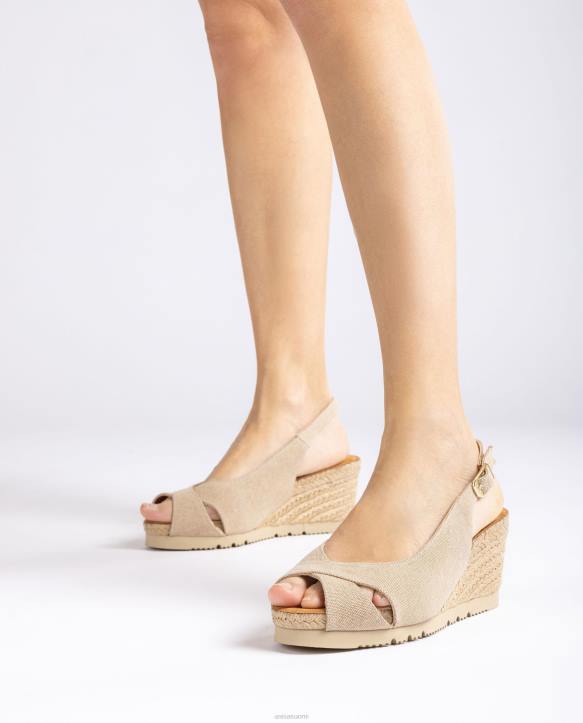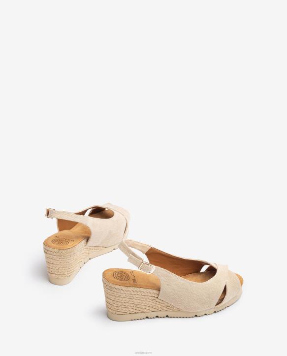 Pyöreä varvashihna takaespadrille valmistettu ecolino-kankaasta. Tämä kangas on valmistettu 100% kierrätetyistä muovipulloista. ristikkäiset olkaimet edessä ja nilkkahihna, jota voidaan säätää metallisoljella. 7 cm korkea kiila päällystetty luonnollisella juutilla ja 2,5 cm alusta. eva-pohja, joka on kevyempi ja joustavampi kuin koskaan ennen superlight-tekniikan ansiosta. unisa rakastaa planeettaa!