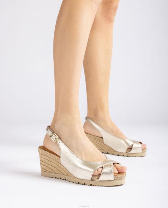Pyöreäkärkinen espadrilli, valmistettu metallista tehostenahasta. ristikkäiset olkaimet edessä ja nilkkahihna, jota voidaan säätää metallisoljella. 7 cm korkea kiila päällystetty luonnollisella juutilla ja 2,5 cm alusta. eva-pohja, joka on kevyempi ja joustavampi kuin koskaan ennen superlight-tekniikan ansiosta. uusi juuttikokoelmamme yllättää sinut.