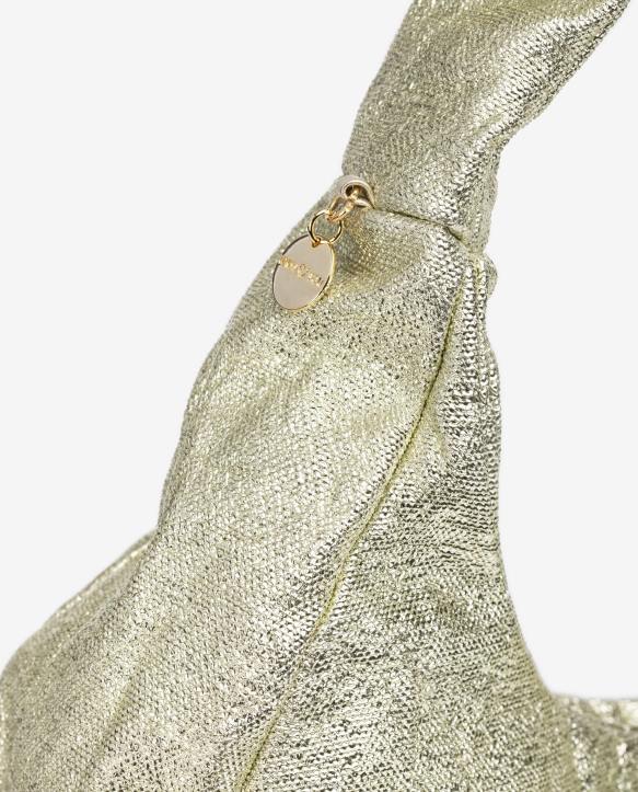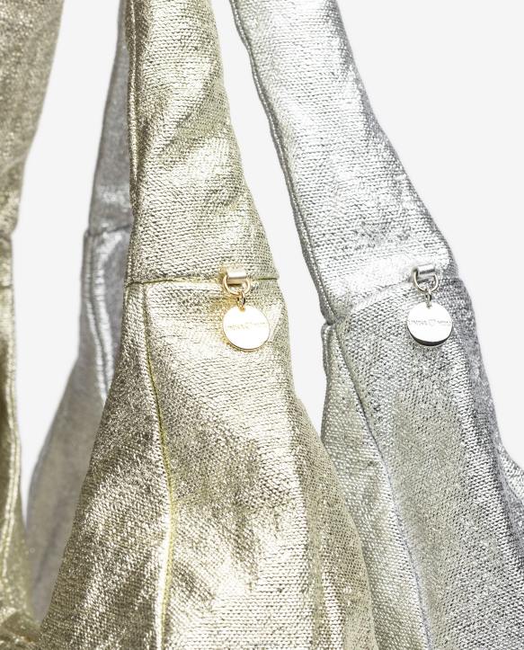 suuri olkalaukku, joka on valmistettu metallista kangaskankaasta. sisällä vetoketjullinen tasku. koko: 57 cm x 46 cm x 14 cm