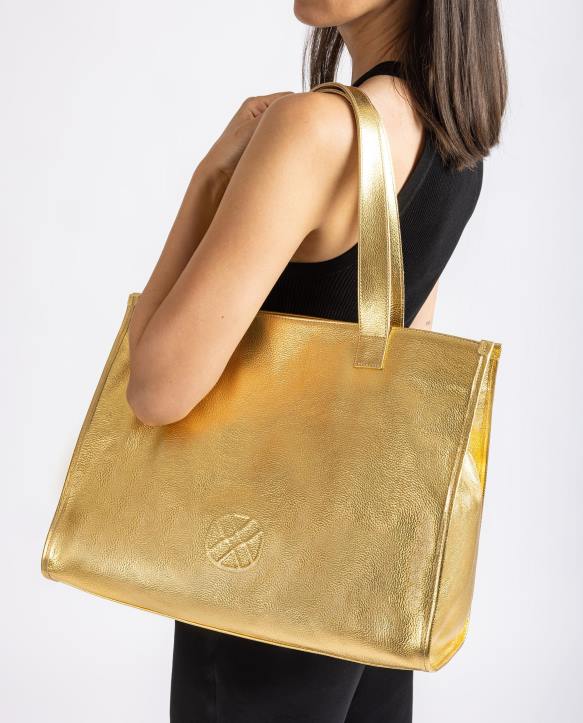 suuri laukku, joka on valmistettu metallista tehostenahasta. olkaimet ja magneettinen nappikiinnitys. sisällä vetoketjullinen tasku. koko: 30 cm x 41 cm x 18 cm