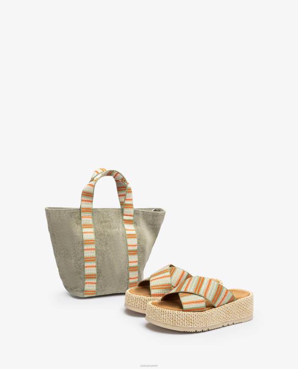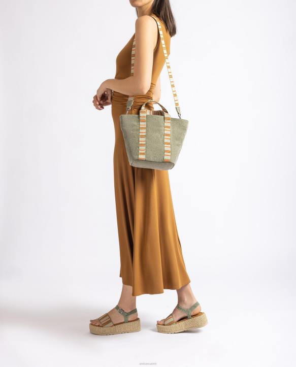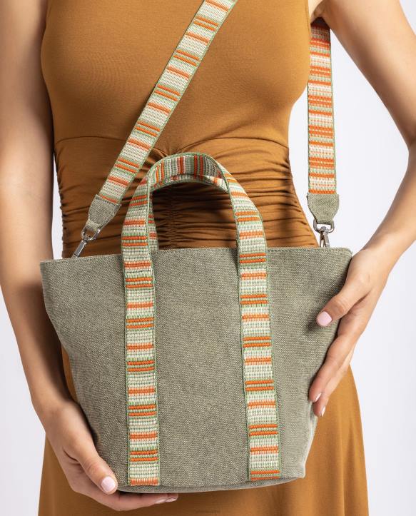 Ecolino-kankaasta valmistettu keskikokoinen laukku. Tämä kangas on valmistettu 100% kierrätetyistä muovipulloista. lyhyet moniväriset kahvat ja säädettävä crossbody-hihna sisällä. magneettinen nepparikiinnitys. koko: 23 cm x 33 cm x 14 cm