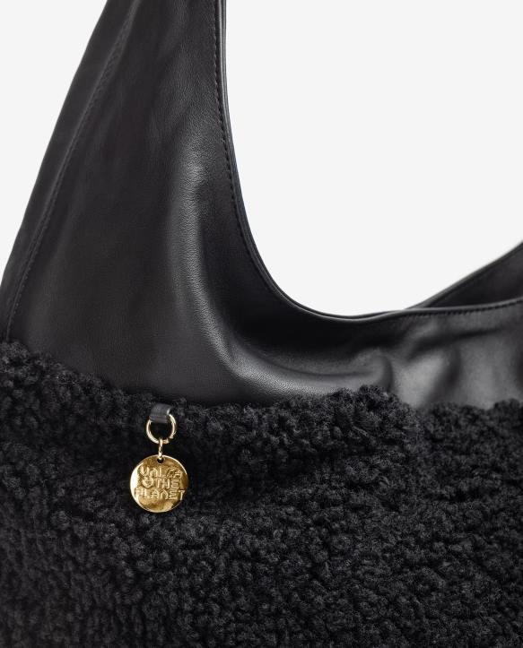 Big bucket style laukku, valmistettu turkiskankaasta. kahva ja tikkaukset nahkaa. pitkä kullanvärinen olkaketju. tämä laukku on huomion keskipiste. 50 cm x 36 cm x 18 cm