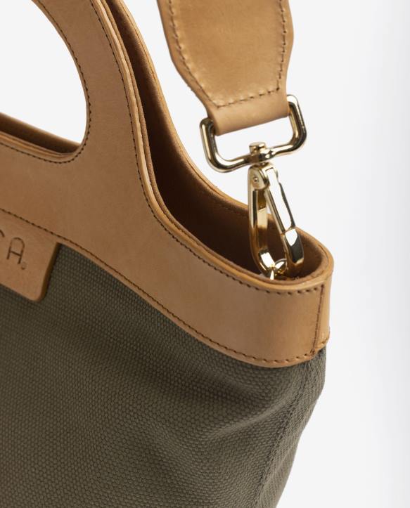 pieni kierrätyskankaasta valmistettu käsilaukku. nahkakahvalla ja unisa-logoverhoilulla. säädettävä crossbody-hihna sisällä ja magneettinen nappikiinnitys. 23 cm x 35 cm x 13 cm