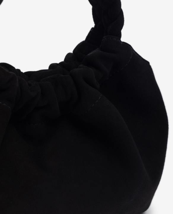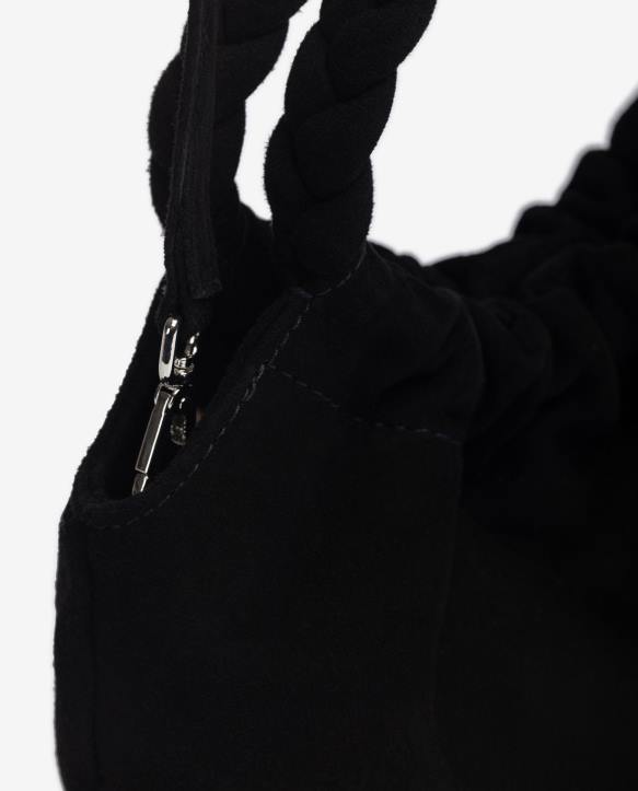 pieni mokkanahkainen käsilaukku. pyöreät punotut kahvat yhteensopivaa sävyistä mokkaa. säädettävä crossbody-remmi mokkanahkaa. magneettinen nepparikiinnitys. koko: 15cm x 20cm x 6cm