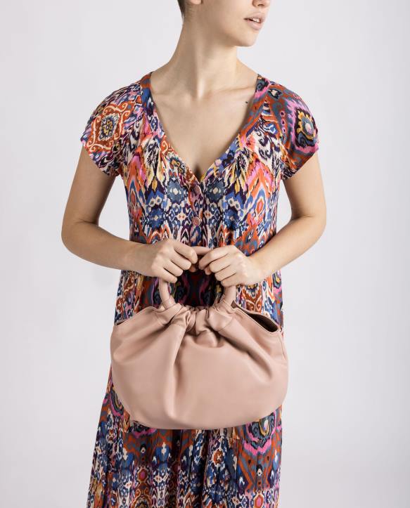 käsilaukku, jossa on värin mukainen lyhyt pyöreä kahva. yhteensopiva säädettävä crossbody-hihna sisällä ja magneettinen nepparikiinnitys. 25 cm x 33 cm x 14 cm