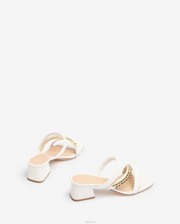 nahasta valmistettu neliömäinen sandaali. ketjuverhoilu hihnoissa jalkaterän päällä. sävyyn sopiva 5cm kantapää. kevyt ja joustava nahkapohja.