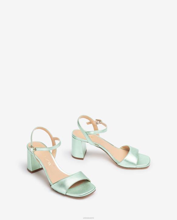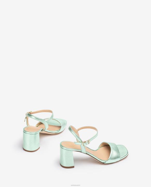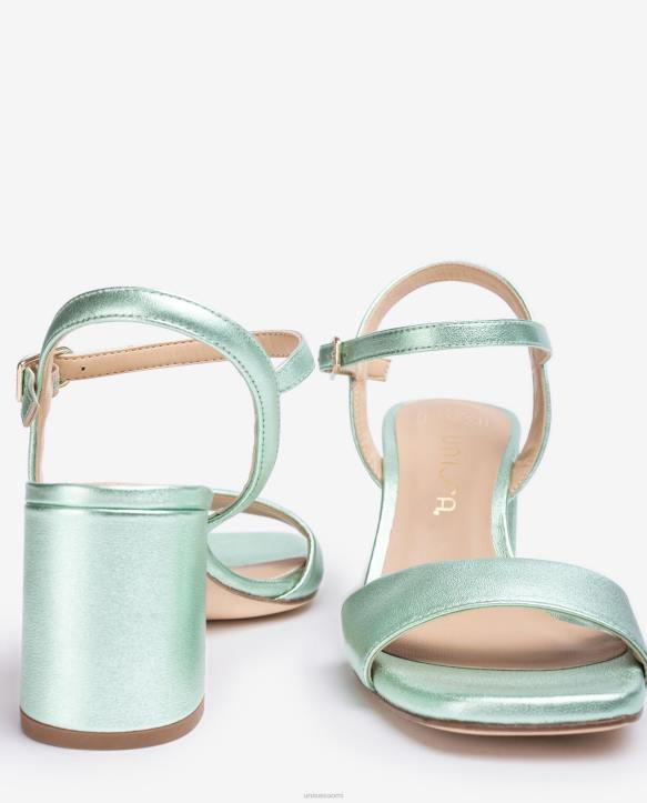 neliömäinen sandaali, valmistettu metallista tehostenahasta. leveä 6 cm kantapää yhteensopivassa sävyssä. nilkkahihna, jota voidaan säätää metallisoljella. nahkapohja.