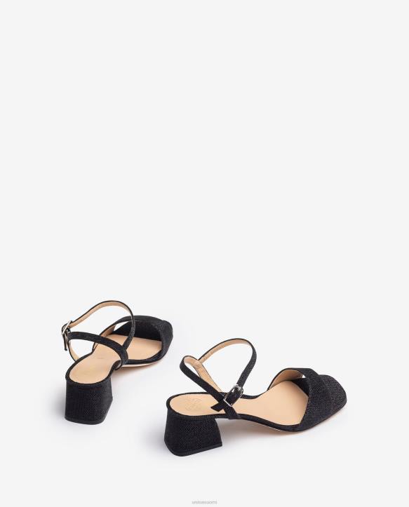neliömäinen sandaali kiiltävästä kankaasta. sävyyn sopiva leveä 5 cm korkea kantapää. nilkkahihna, jota voidaan säätää metallisoljella. nahkainen pohja. olennaisia unisa-klassikoita, joita uudistetaan joka kausi.