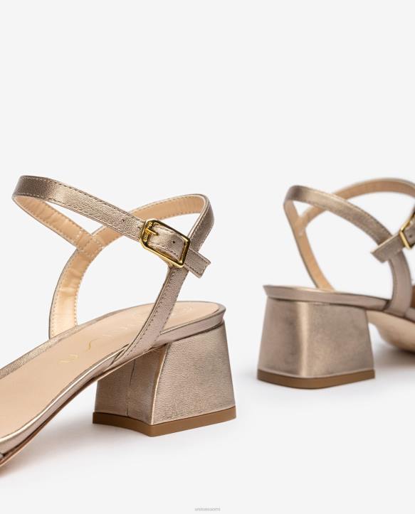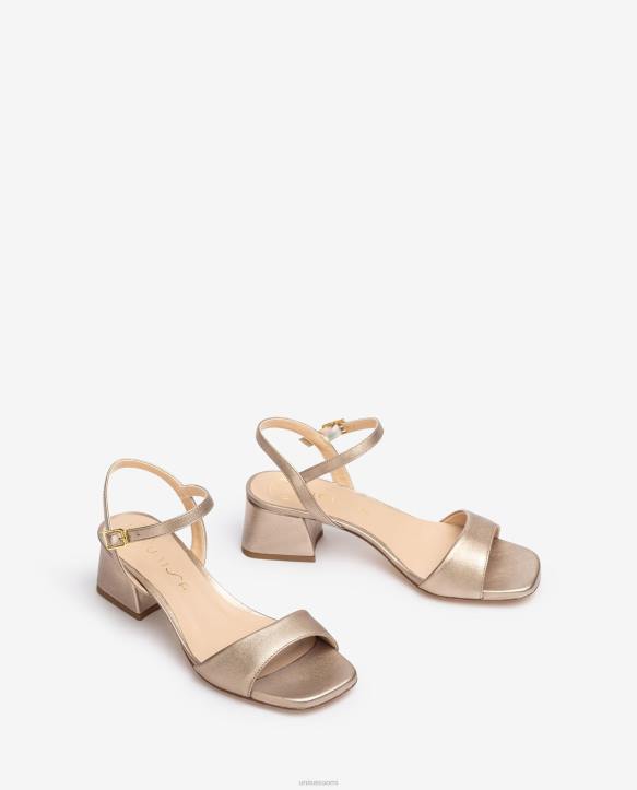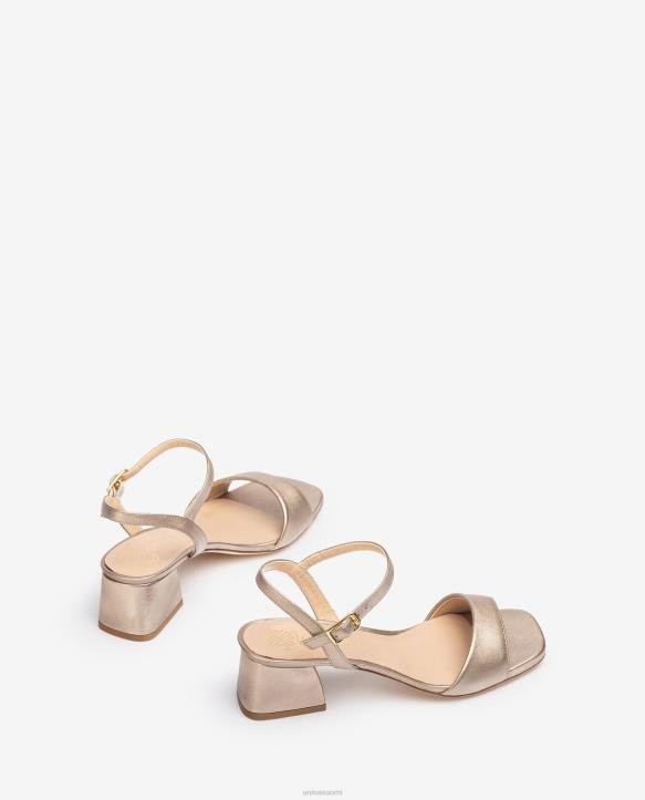 neliömäinen sandaali, valmistettu metallista tehostenahasta. sävyyn sopiva leveä 5 cm korkea kantapää. nilkkahihna, jota voidaan säätää metallisoljella. nahkainen pohja. olennaisia unisa-klassikoita, joita uudistetaan joka kausi.
