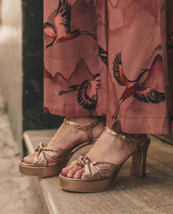nahasta valmistettu pyöreäpohjainen sandaali. leveät olkaimet, joissa solmu edessä ja nilkkahihna, jota voidaan säätää metallisoljella. 3 cm alusta ja 9 cm korkea kantapää. kevyt, luistamaton kumipohja. cherubinan uusi unisa-mallisto kiehtoo sinut täydellisyydellään.