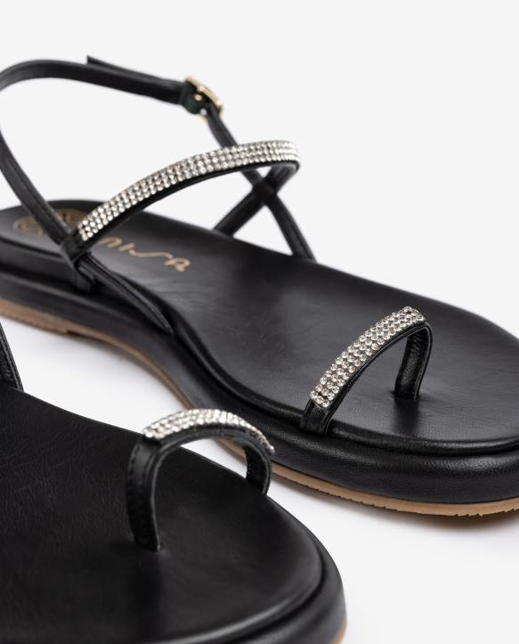 nahasta valmistettu pyöreä varvassandaali. ohuet olkaimet strassireunoilla, joita voidaan säätää metallisoljella. kevyt, joustava, luistamaton, kumipohja.