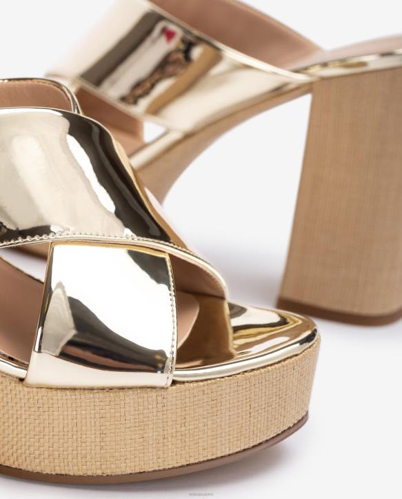 70-luvun tyylinen raffia- ja peilivaikutteinen sandaali. kahdella isolla ristikkäishihnalla. leveä 10,5 cm kantapää ja 3,2 cm alusta.