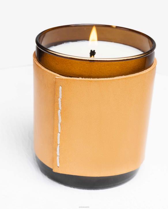 230 gr. Tuoksukynttilä, 100 % kasvivaha ja 100 % puuvillalanka. meripihkan värinen lasikuppi, lehmännahkainen koristelu, käsin ommeltu ja kaiverrettu kultaefektillä.