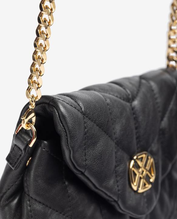 pieni käsilaukku pehmustetusta nahkavaikutteisesta kankaasta. magneettisuljin, jossa monogrammiyksityiskohta läpässä. irrotettava metallinen crossbag-ketju. 13 cm x 19 cm x 6 cm