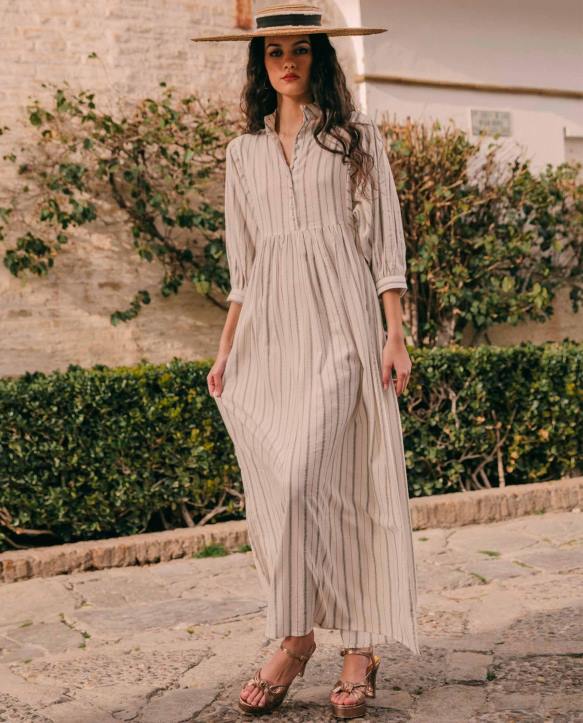 se on tunikatyyli, pitkä mekko, korkea vyötäröllä leikkaus, napit edessä ja mandariinikaulus. kolme neljäsosaa pituiset, pullistumat hihat, joissa hihansuut.