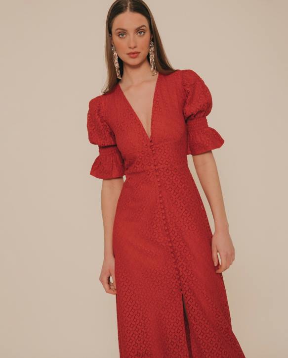 Se on vivahteikas pitsinen midi-mekko, jossa evase-hame. siinä on v-pääntie, jonka alla on nappisarja. pullistuneissa hihoissa on laskostettu hunajakennohousu.