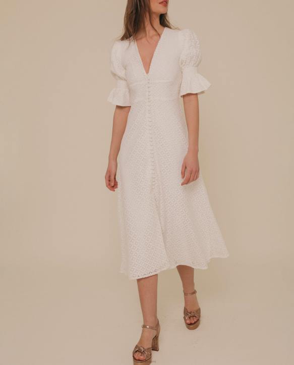 Se on vivahteikas pitsinen midi-mekko, jossa evase-hame. siinä on v-pääntie, jonka alla on nappisarja. pullistuneissa hihoissa on laskostettu hunajakennohousu.